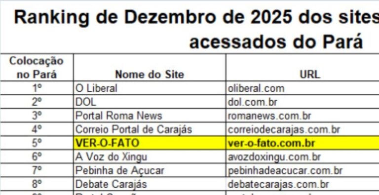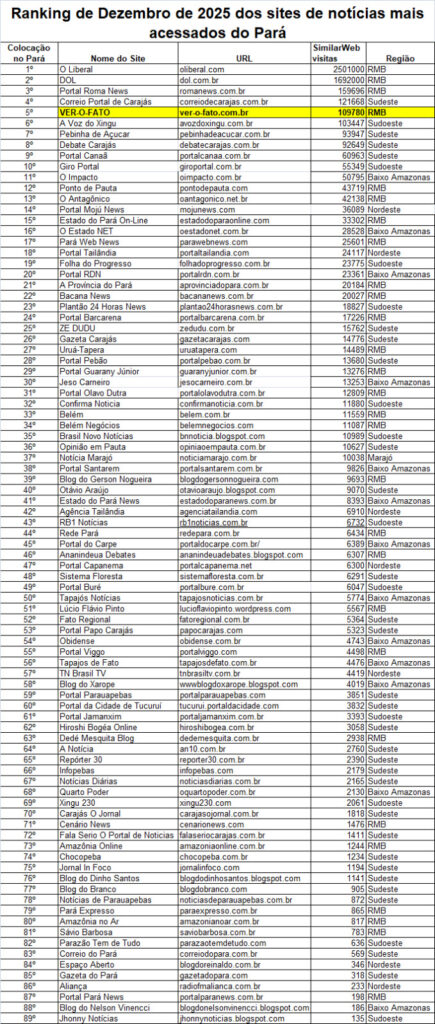 O Portal A Voz do Xingu alcançou, em dezembro de 2025, a melhor colocação desde a sua criação. O site passou a ocupar a 6ª posição entre os portais de notícias mais acessados do estado do Pará, conforme dados da plataforma Similarweb, divulgados nesta sexta-feira, 9 de janeiro de 2026, pelo portal Ver-o-Fato.