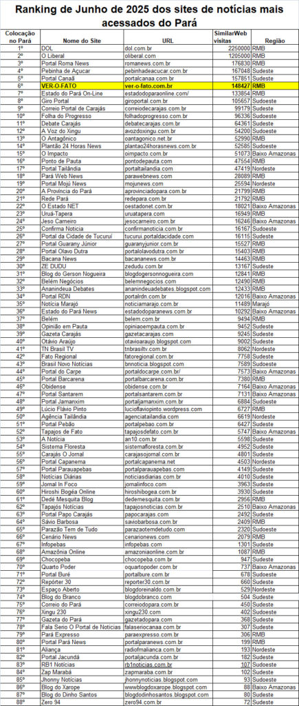 De acordo com dados da plataforma SimilarWeb, divulgados nesta sexta-feira (8 agosto 2025) pelo site Ver-o-Fato, o portal A Voz do Xingu se consolidou, em julho de 2025, como o 12º site mais acessado do estado do Pará, mantendo a liderança na região sudoeste paraense.