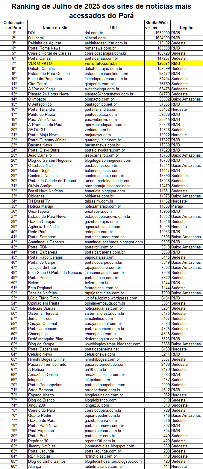 De acordo com dados da plataforma SimilarWeb, divulgados nesta sexta-feira (8 agosto 2025) pelo site Ver-o-Fato, o portal A Voz do Xingu se consolidou, em julho de 2025, como o 12º site mais acessado do estado do Pará, mantendo a liderança na região sudoeste paraense.