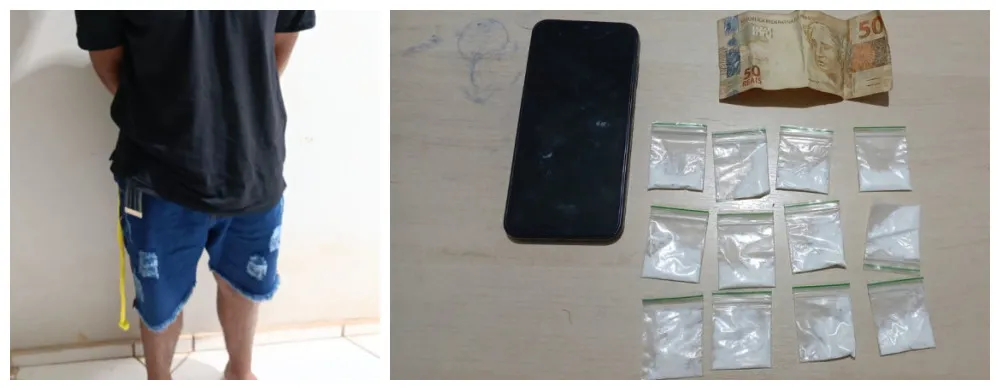 Durante abordagens em uma conveniência localizada no centro da cidade, os agentes interceptaram o adolescente, identificado pelas iniciais A.S.S., morador do bairro Pimentolândia, nas proximidades do banheiro do estabelecimento. Com ele, foram encontrados 12 papelotes de substância análoga à cocaína, acondicionados em uma carteira de cigarro, além de uma nota de R$ 50 em dinheiro e um aparelho celular Samsung A13, de cor preta.