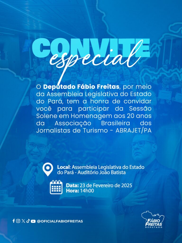 A Assembleia Legislativa do Estado do Pará (Alepa) vai realizar, no próximo dia 23 de fevereiro, uma sessão solene em comemoração aos 20 anos de atuação da Associação Brasileira de Jornalistas de Turismo – seccional Pará (Abrajet/PA). A solenidade é de iniciativa do deputado estadual Fábio Freitas (Republicanos) e está marcada para 14h, no Auditório João Batista.