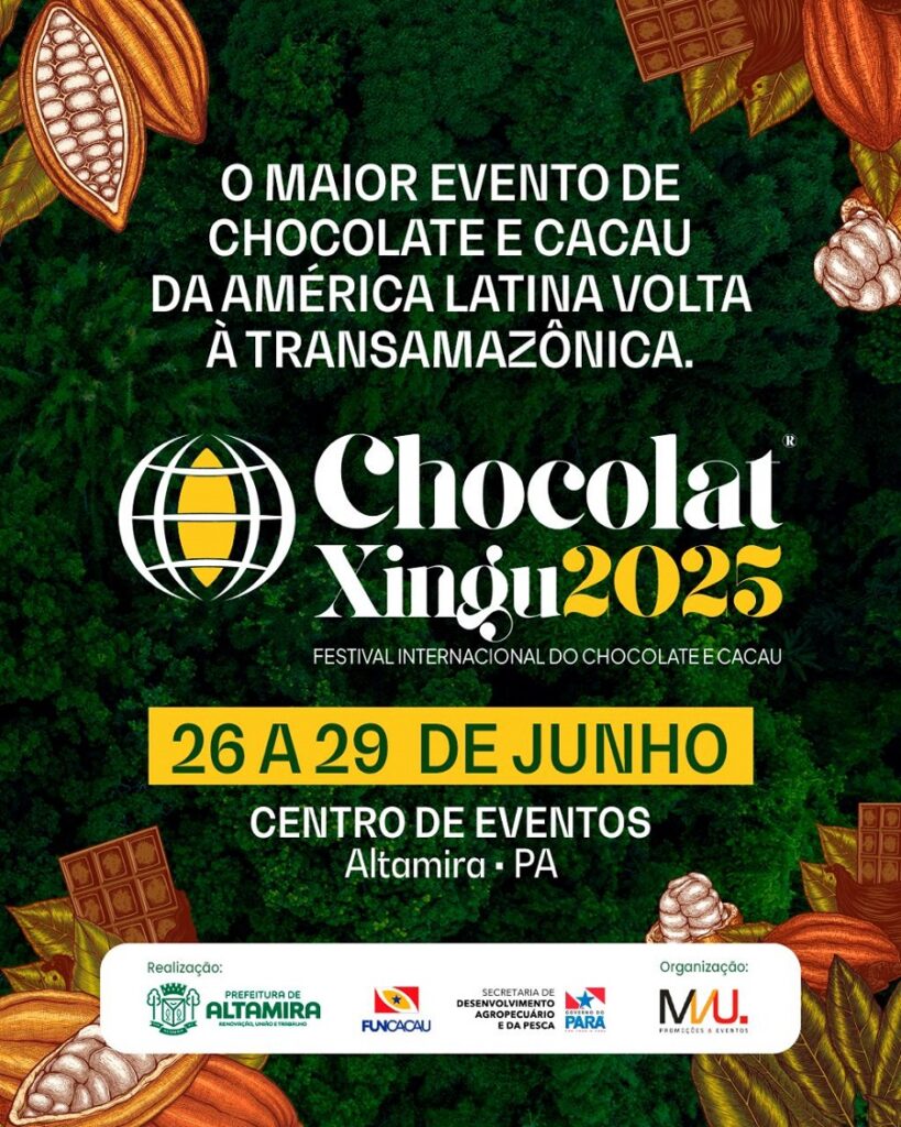Altamira, no sudoeste do Pará, será o palco da maior feira de chocolate e cacau da América Latina: o Chocolat Xingu 2025, que acontece entre os dias 26 e 29 de junho. Em sua quarta edição, o evento reunirá expositores, chocolatiers, chefs renomados e milhares de visitantes no Centro de Eventos Vilmar Soares, localizado no centro da cidade.