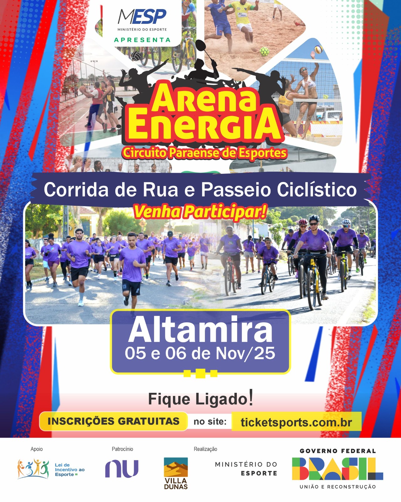 Nos dias 5 e 6 de novembro, a cidade de Altamira, no sudoeste do Pará, será palco de mais uma edição do Arena Energia – Circuito Paraense de Esportes, um projeto que está movimentando o Estado com muita atividade física, lazer e integração social. O evento contará com corrida de rua e passeio ciclístico, reunindo atletas, famílias e amantes do esporte em uma grande celebração de saúde e vitalidade.