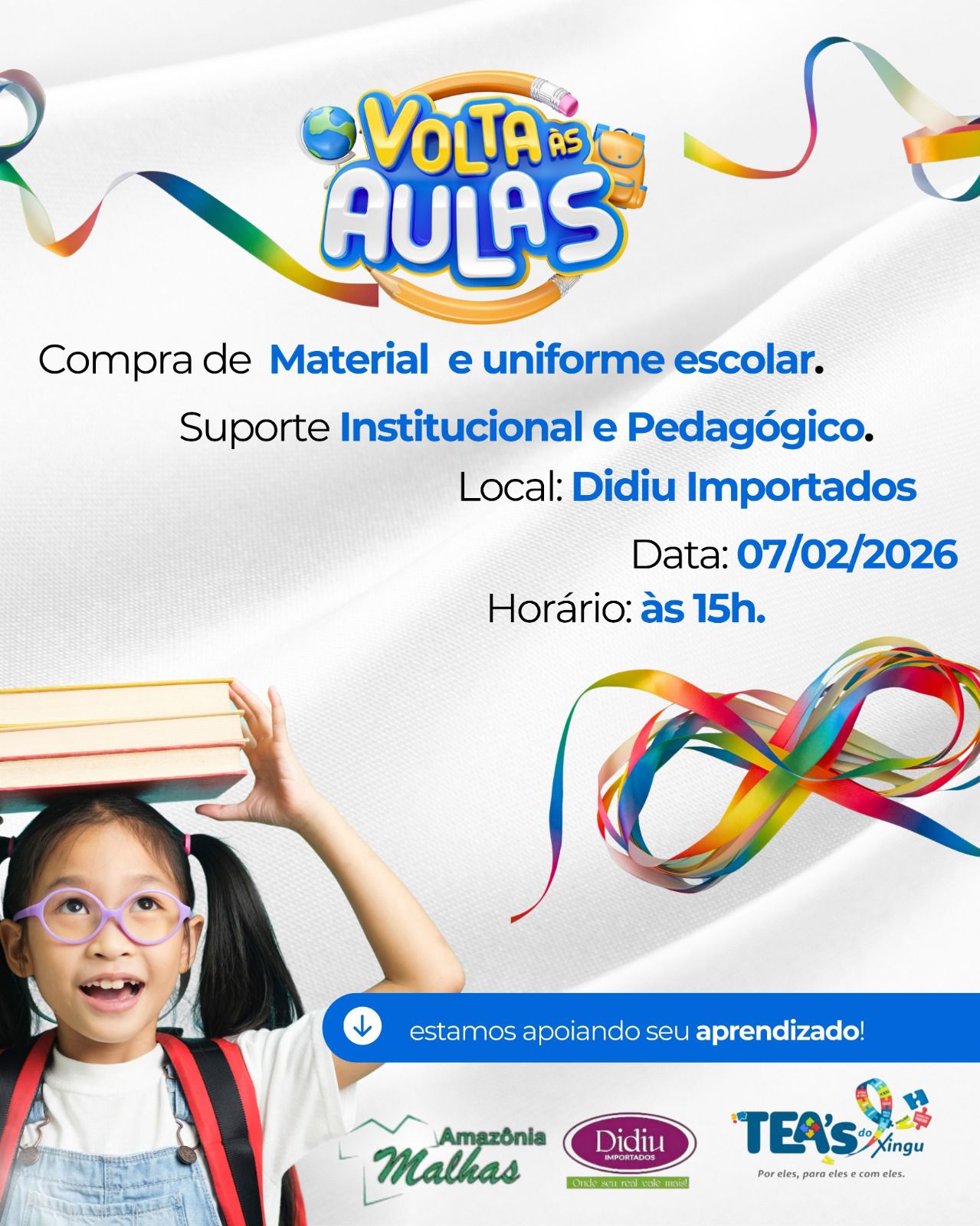 A Associação TEAS do Xingu convida as famílias de alunos neuroatípicos para participarem de uma ação especial voltada à compra de material escolar e uniformes. A iniciativa será realizada neste sábado, dia 7 de fevereiro de 2026, a partir das 15h, na loja Didiu Importados, que funcionará de forma exclusiva e inclusiva para atender os estudantes e seus familiares.