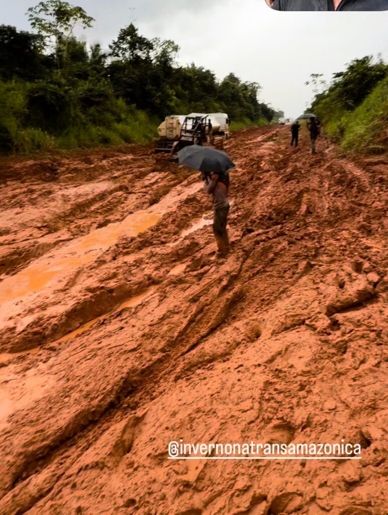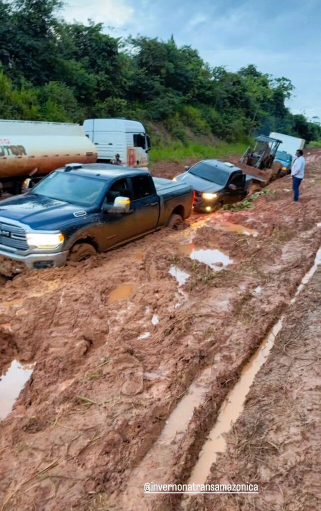 Registros feitos durante a tarde pela “Equipe do Inverno na Transamazônica” mostram a gravidade da situação. As imagens evidenciam um cenário de lama intensa, dificultando a passagem de carros e caminhões e comprometendo completamente o tráfego na área.