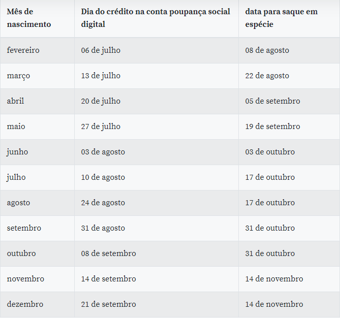 O calendário foi estabelecido com base no mês de nascimento do trabalhador e contém dados que correspondem a valores de crédito na conta de armazenamento digital social, quando os recursos podem ser usados ​​em estatísticas eletrônicas, além de dados a partir de quando os recursos disponíveis estão disponíveis para saque em espécie ou transferência para outras contas.