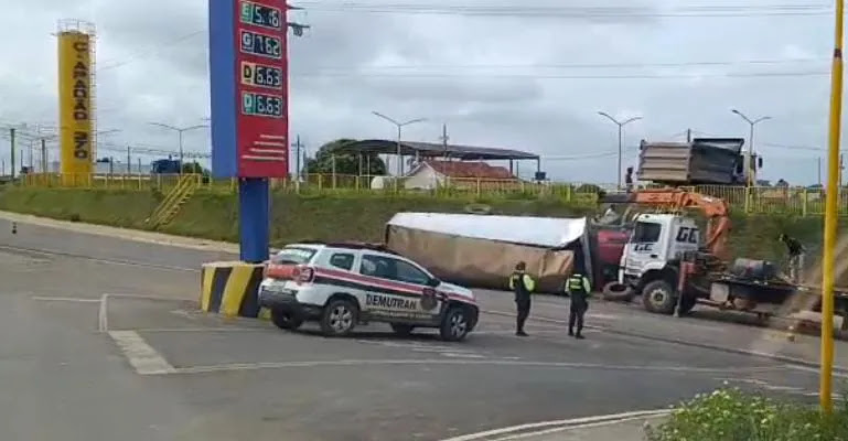 Um caminhão-baú carregado com bananas tombou na noite de terça-feira (2.dez.2025) no perímetro urbano da rodovia PA-370, na saída de Uruará, no sudoeste do Pará. O incidente ocorreu no sentido Santarém.