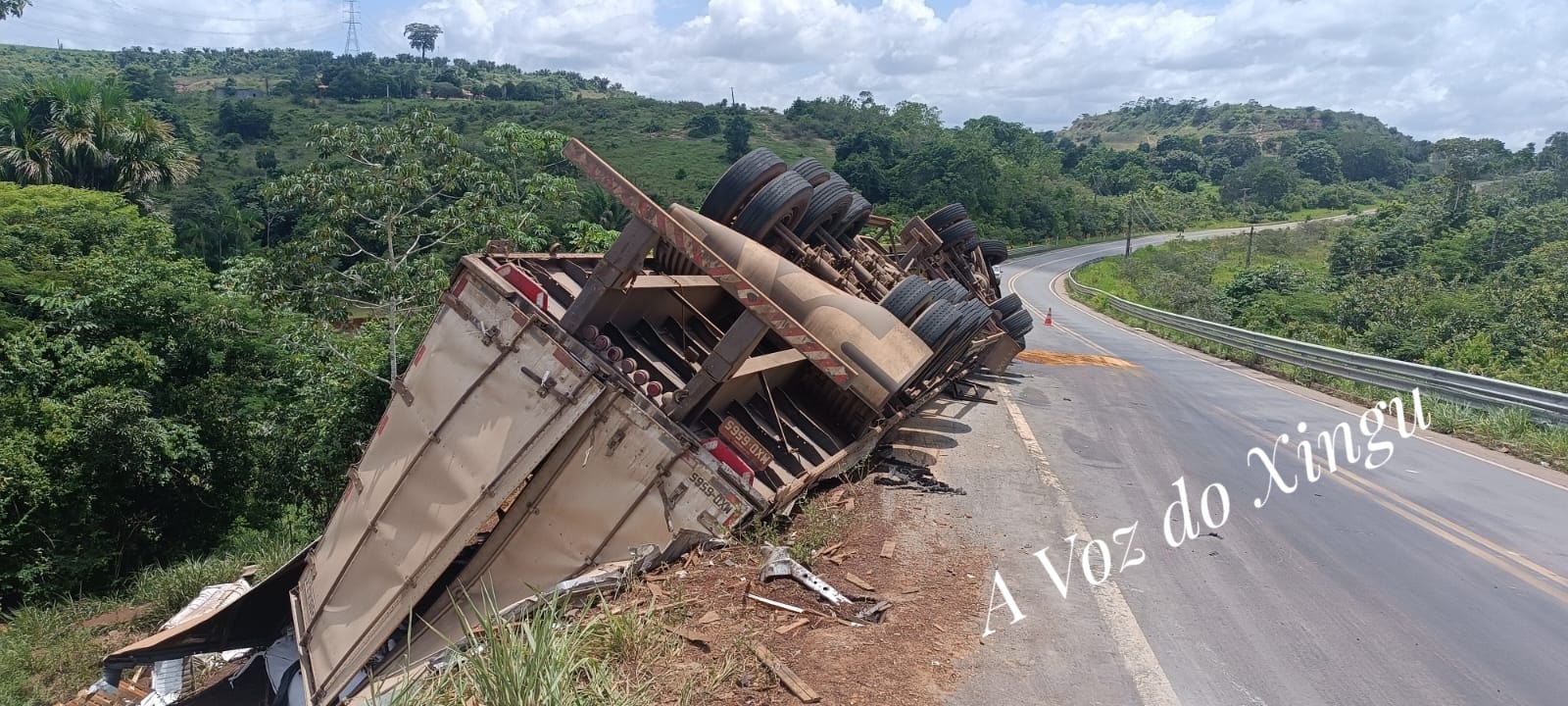 Uma carreta carregada de amêndoas de cacau tombou na BR-230, Rodovia Transamazônica, na noite desta quinta-feira (29.jan.2026), na altura da ladeira do Cigano, no município de Vitória do Xingu, no sudoeste do Pará. O acidente foi registrado por volta das 21h.