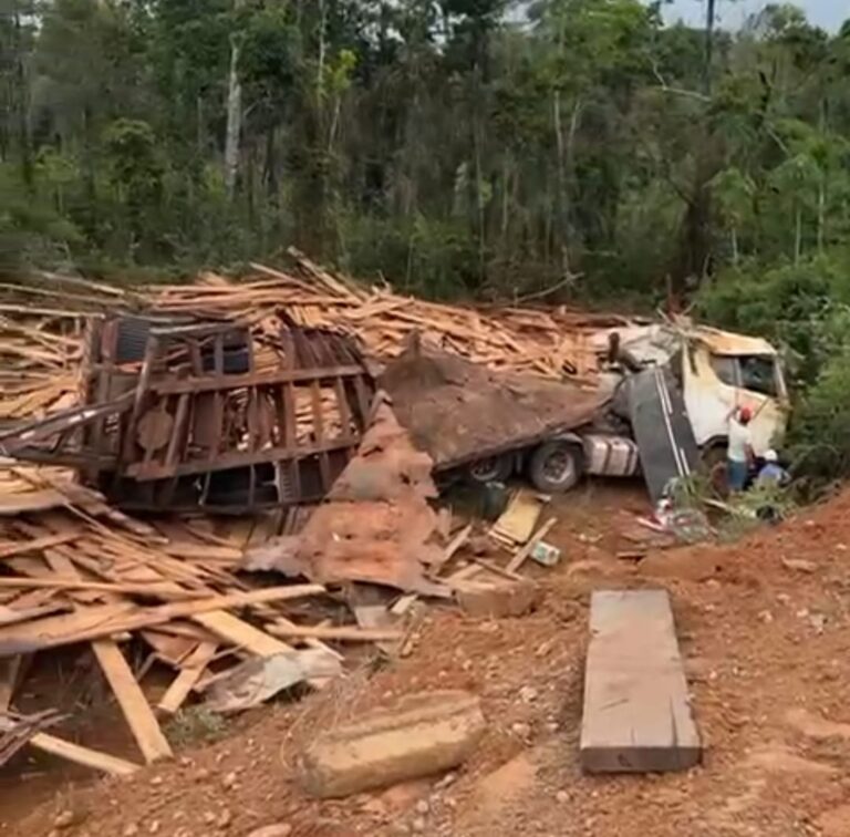 Uma carreta carregada de madeira serrada tombou na manhã desta quinta-feira, 20 de novembro, na PA-370 — conhecida como Transuruará — rodovia que liga os municípios de Uruará e Santarém, no sudoeste do Pará.