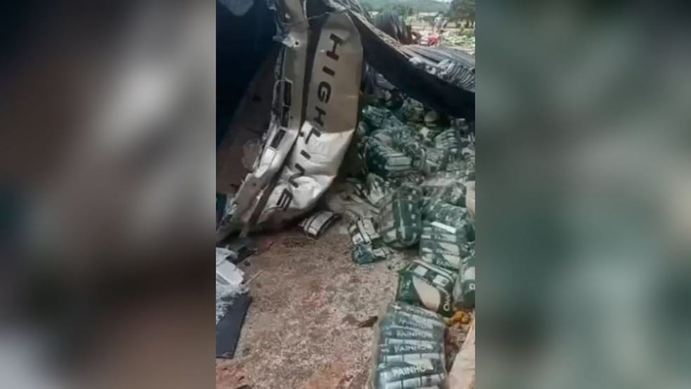 Desgovernada, a carreta saiu da pista e acabou tombando às margens da rodovia. A carga de arroz ficou espalhada pelo acostamento.