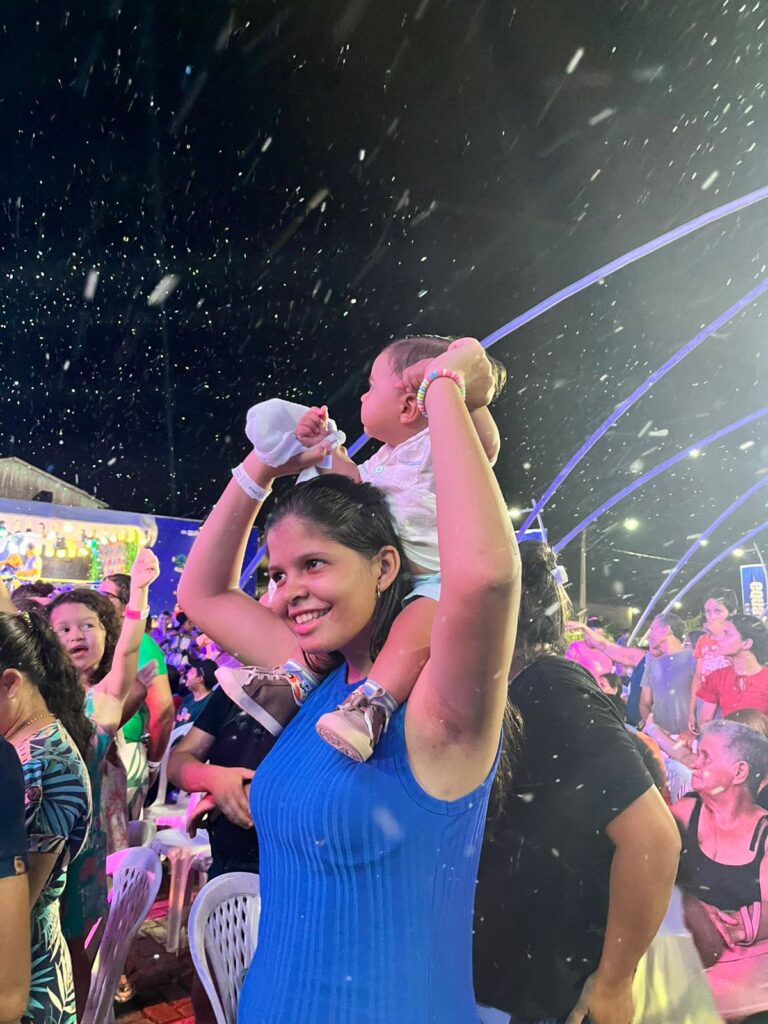 A neve artificial arrancou as primeiras gargalhadas da criançada. O efeito transformou o espaço em um verdadeiro cenário natalino, rendendo corridas, gritos animados e muitas fotos das famílias.