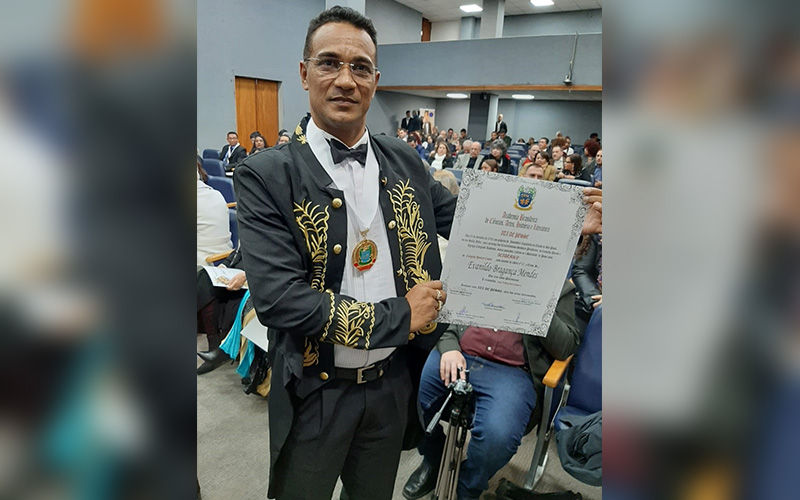 Evanildo Bragança Mendes recebeu o fardão de imortal das mãos de outros imortais reunidos para a cerimônia e que foram responsáveis pela aprovação de seu nome para integrar o seleto grupo nacional.