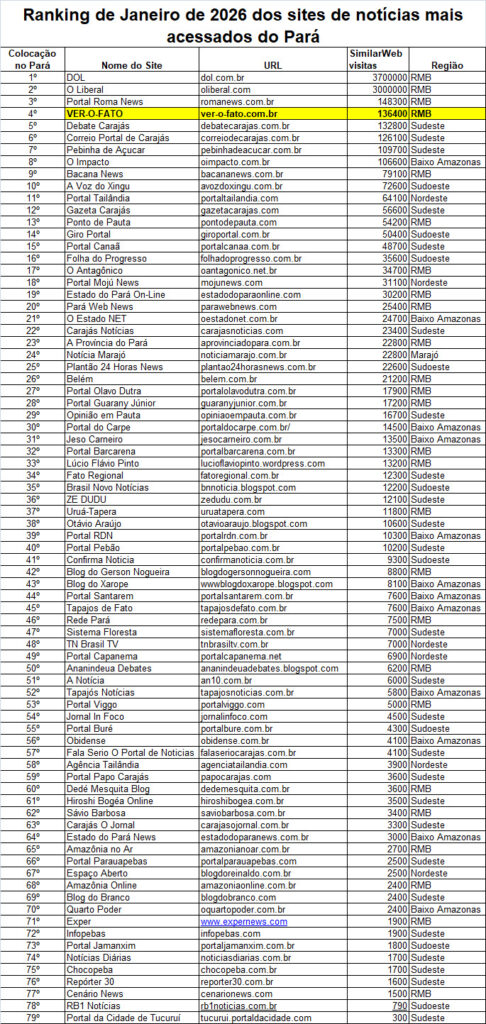 Estar entre os dez sites de notícias mais acessados do Pará não é apenas um número. É o reflexo da confiança do leitor. Em janeiro de 2026, o portal A Voz do Xingu alcançou a 10ª colocação no ranking estadual de audiência digital.