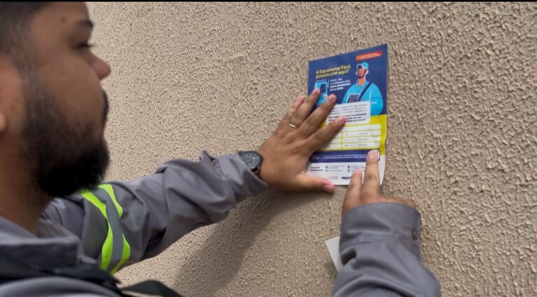 O adesivo é fixado próximo ao medidor e o cliente registra os dados da leitura. Quando a equipe retorna ao local, as informações são conferidas e validadas.