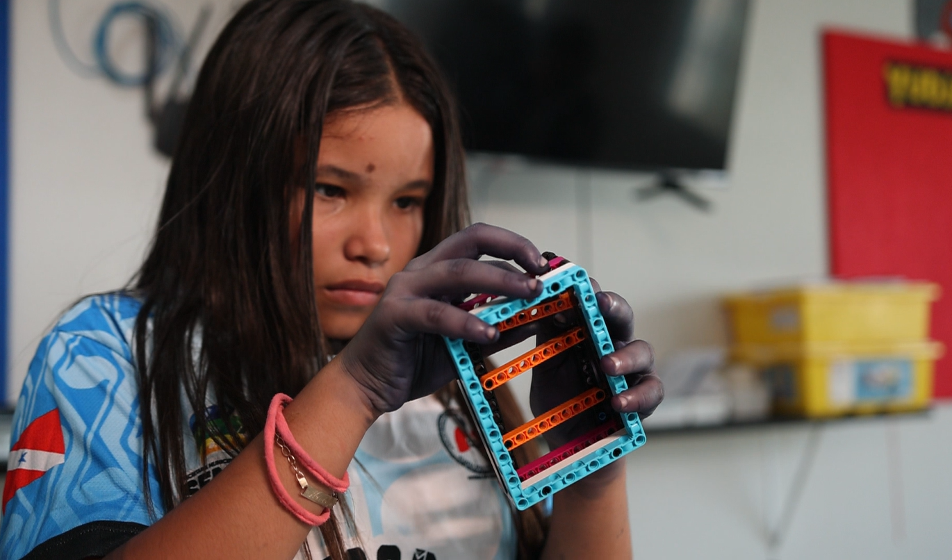 Carine Nandaiya, de 11 anos, estudante do 6º ano e integrante da equipe Juruna Bots, vive com empolgação a experiência com a robótica na escola. “Desde que chegou aqui, eu queria muito participar. Achei que era só montar o robô, mas tem que programar, ajustar, posicionar tudo certinho. Eu sempre quis montar um desses, tipo Lego com robôs, e agora estou realizando esse sonho”, conta, animada.