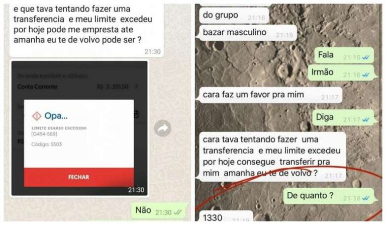 Na foto do perfil, um homem sentado à beira de uma praia olhando para o lado – provavelmente não correspondente à identidade do criminoso. A conversa começa de forma “normal”, com uma breve apresentação à vítima. Depois, o homem diz que participa do mesmo grupo de aplicativo e que precisa de um favor. Ele afirma que estava tentando fazer uma transferência bancária e o limite do dia excedeu. Posteriormente, pede para a vítima transferir a quantia de R$ 1.330. Pelo menos cinco pessoas receberam as mesmas mensagens na noite desta quarta-feira, 16.