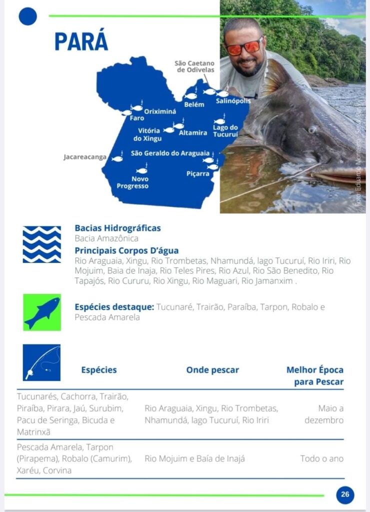 O estudo reforçou que o Pará, com rios caudalosos, afluentes e lagos de grande porte, abriga espécies altamente valorizadas pelos praticantes, como tucunaré, pirarucu, tambaqui, piraíba, trairão, pirara, robalo (camurim) e tarpon (pirapema), entre outros. O documento informa, também, que locais como o Lago de Tucuruí, os Rios Xingu, Tapajós, Trombetas, Araguaia e Iriri figuram entre os principais polos de pesca esportiva do país.