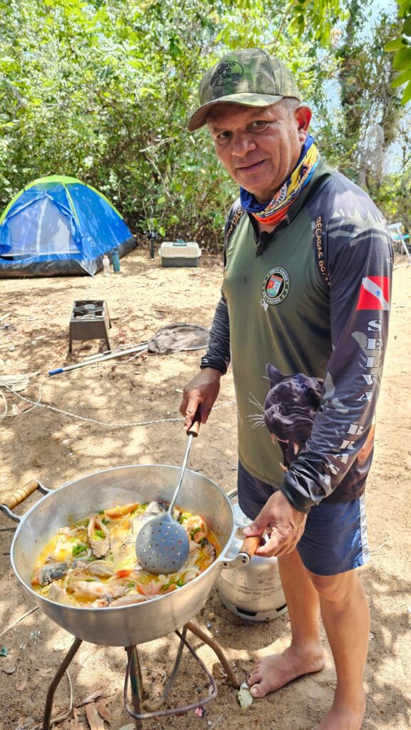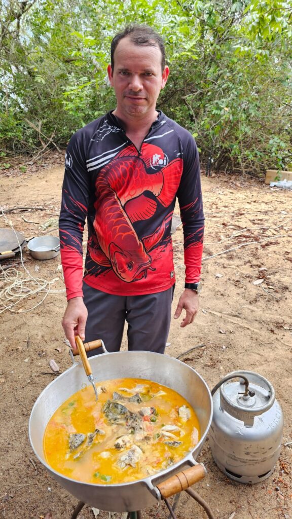 “Hoje fizemos uma caldeirada com tucunaré pescado pela manhã”, contou André Camargo, de Altamira. Já Idélcio Gonçalves foi o responsável por preparar o tradicional caldo de piranha, temperado com leite de coco e ervas regionais.