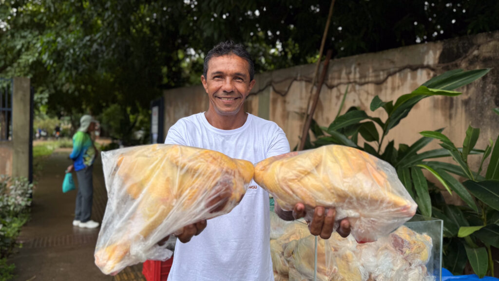 Paulo Santos é agricultor familiar do travessão da Firma, zona rural de Altamira. Proprietário de uma granja, ele utiliza produtos biodegradáveis como urucum e outros para produzir a ração dos animais. “O nosso produto, que é o frango da Aves Xingu, um frango semiorgânico, tratado e alimentado da forma mais natural possível. Chega aqui um produto semiorgânico para o consumidor.”