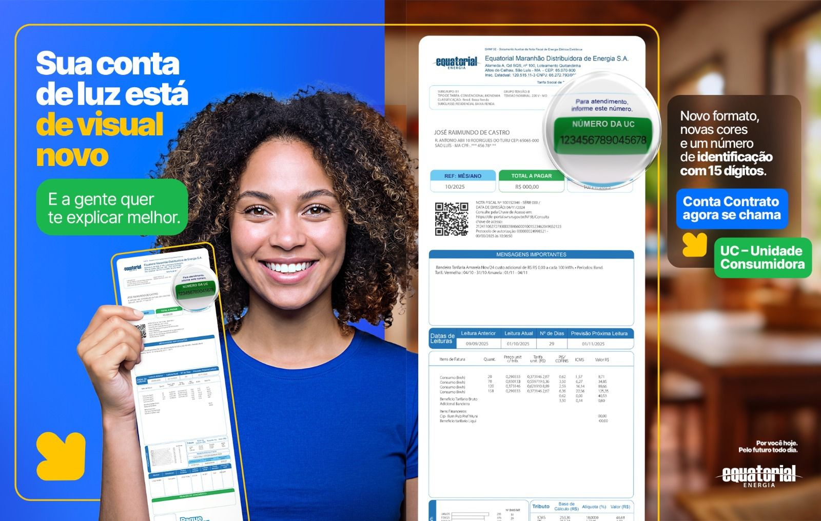 Com a mudança, os clientes do Grupo Equatorial passarão a receber a nova fatura de energia, tanto nas versões impressas quanto nas digitais. O layout foi totalmente redesenhado, adotando um visual mais moderno, com predominância das cores azul e verde.
