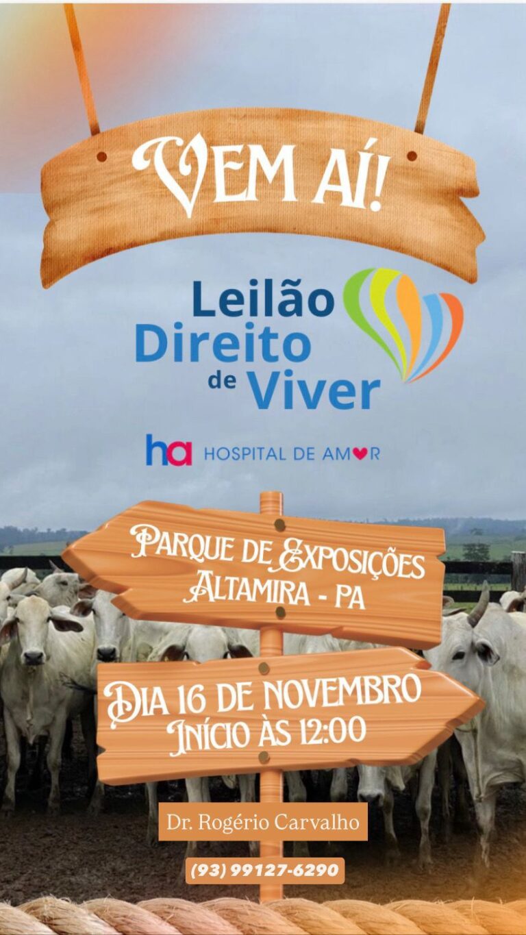 O Hospital de Amor promove neste domingo (16 de novembro) o tradicional “Leilão Direito de Viver“, em Altamira, no sudoeste do Pará. O evento será realizado no Parque de Exposições Antônio Inácio de Lucena, a partir das 11h, e deve mobilizar moradores, produtores rurais e empresários da região em prol do tratamento de pacientes com câncer.
