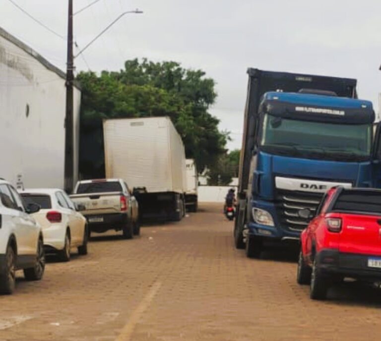 Imagens enviadas ao portal A Voz do Xingu nas primeiras horas desta terça-feira, 31 de março, mostram uma das ruas praticamente intransitável, devido a caminhões estacionados nos dois lados da via.