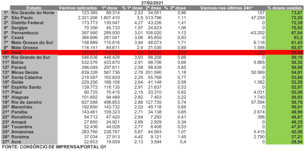 De acordo com dados levantados pelo consórcio de veículos de imprensa, que consolida números sobre a pandemia em todo o País, o Estado do Pará é a 9ª unidade federativa que mais vacinou entre os estados brasileiros contra a Covid-19 até o momento, ficando à frente de Rio Grande do Sul, que ocupa a 10ª posição. O número é proporcional as doses recebidas pelo Ministério da Saúde.
