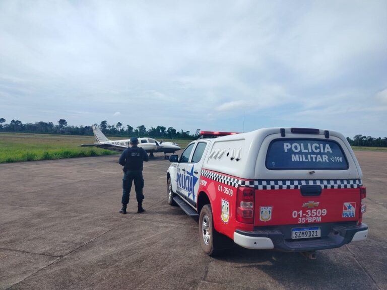 A operação foi coordenada pela inteligência da Polícia Militar do Pará, com apoio de oito viaturas e suporte aéreo. A aeronave interceptada é do modelo Sêneca.