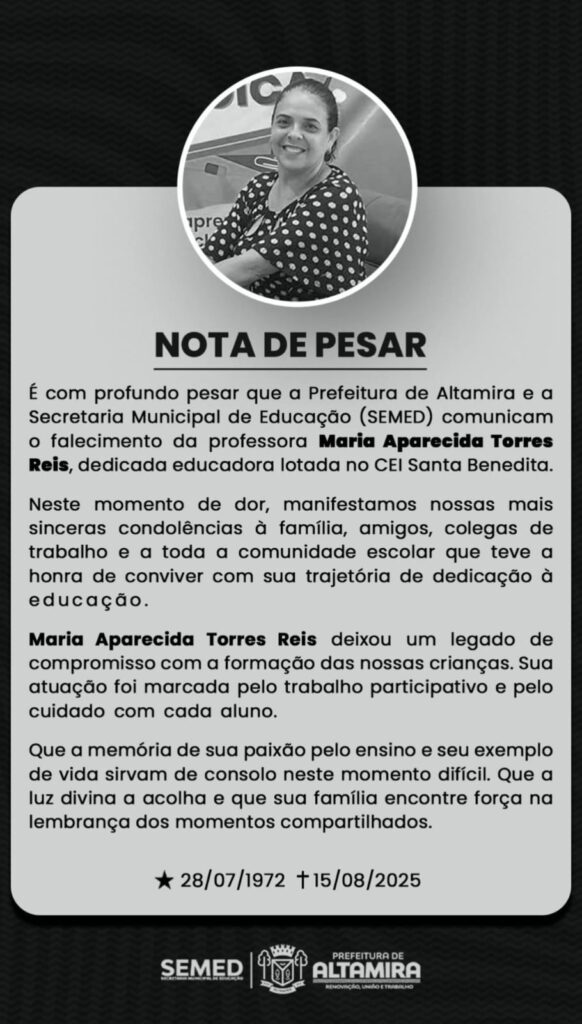 Antes de exercer a função de professora, Maria Aparecida trabalhou por muitos anos como Agente Comunitária de Saúde (ACS) no município. Moradora do bairro Alberto Soares, em Altamira, ela deixa marido, filhos, netos e demais familiares.
