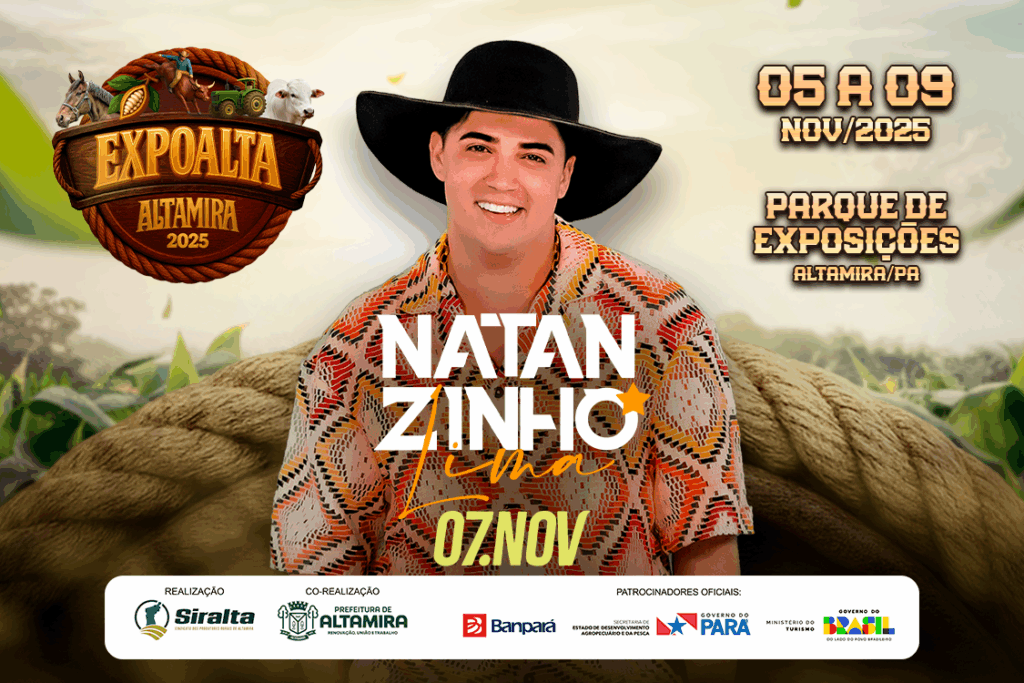 Encerrando a terceira noite da ExpoAlta Altamira, o cantor Natanzinho Lima sobe ao palco à meia-noite. O artista, um dos grandes nomes da nova geração da música nacional, promete um show vibrante, no 12 para animar o público.