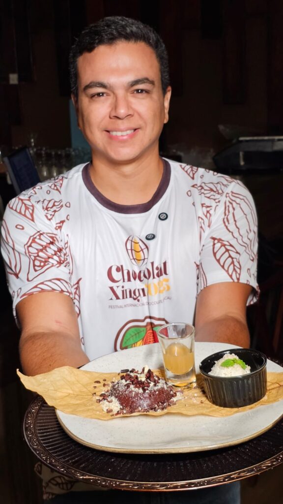 “Elaboramos esse prato com o objetivo de valorizar elementos da culinária regional. Ele é feito com chocolate 60% de intensidade, leva nibs de cacau e, para quem prefere um sabor menos marcante, oferecemos uma redução de mel de cacau servida à parte, em um copinho, que ajuda a equilibrar o amargor. Além disso, acompanha um sorvete artesanal de castanha-do-Pará, produzido aqui mesmo na loja. É importante destacar que essa castanha é adquirida diretamente da Reserva Extrativista do Iriri, o que agrega valor e autenticidade ao ingrediente”, explicou o proprietário Thiago Barbosa.