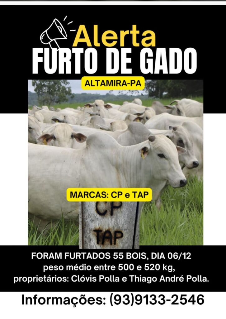 As polícias Militar e Civil de Vitória do Xingu, no sudoeste do Pará, investigam o furto de 55 cabeças de gado da marca Nerole, registrado em uma fazenda localizada no km 10 da PA-415, zona rural do município.